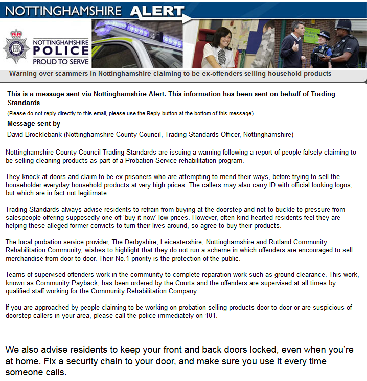 Alert (29th May, 2020): Doorstep Sellers. Nottinghamshire County Council Trading Standards have received information that there is a someone going door to door selling fish. We appreciate that there are genuine fish sellers in the area. However, in the past we have had reports of fish being sold in this way being overpriced, incorrectly stored and being mis-described. There have also been occasions when the fish has not been kept in chilled conditions. Therefore, Trading Standards never recommends buying any goods at the door. To bring a matter to the attention of trading standards or for consumer advice, please contact the Citizens Advice Consumer Service on 0808 223 1133. This number is free from mobiles and landlines.