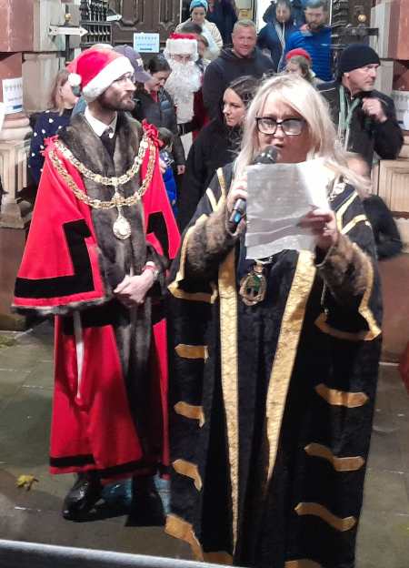 [Right] BDC Cllr Sue Shaw, Chair of BDCD, speaking outside Retford Town Hall on November 24th, 2024 with Cllr David Naylor (Retford Mayor) posing as one of the Father Christmases!